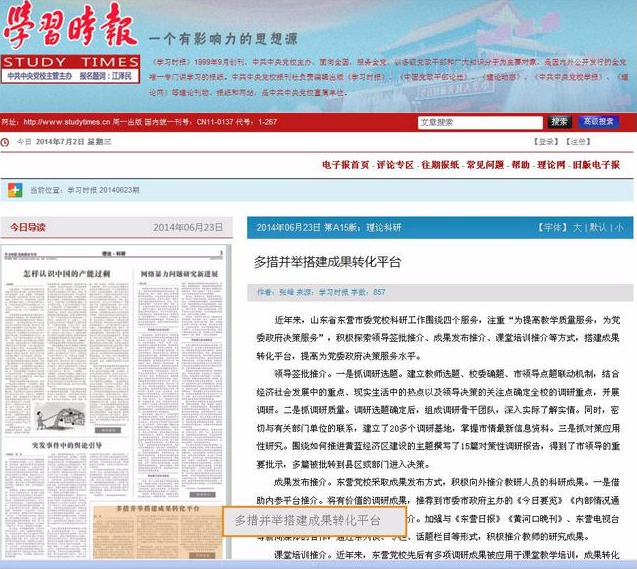 2014年6月23日,中央党校主办的《学习时报》党校教育专刊刊登了我校《多措并举搭建成果转化平台》的经验做法。文章详细介绍了我校科研工作注重“为提高教学质量服务,为党委政府决策服务”,积极探索领导签批推介、成果发布推介、课堂培训推介等方式,搭建成果转化平台,提高为党委政府决策服务水平的经验做法。