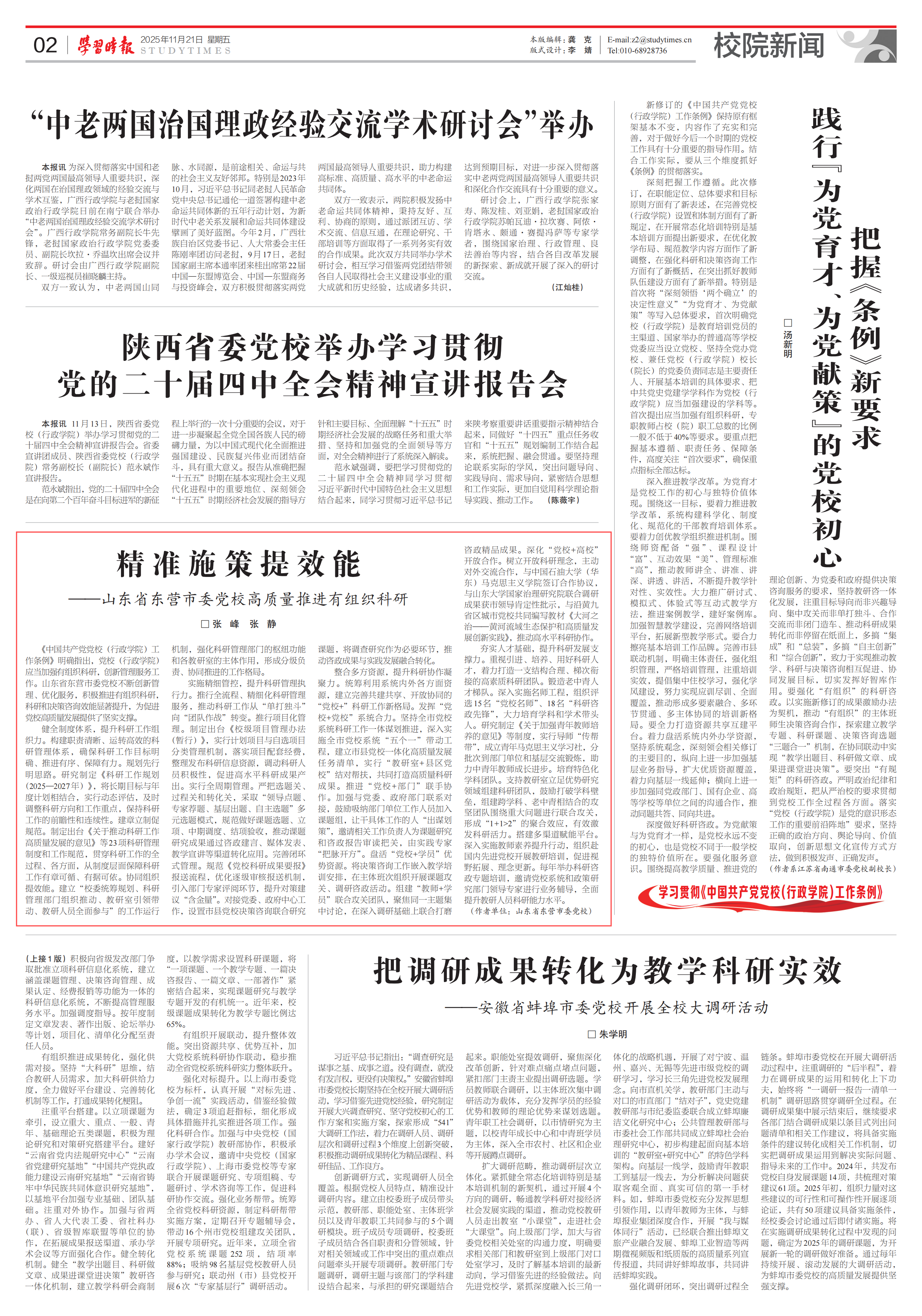2025年11月21日,《学习时报》第2328期“校院新闻”栏目刊发了我校经验交流文章《精准施策提效能——山东省东营市委党校高质量推进有组织科研》,宣传推介了我校创新管理、优化服务,积极推进有组织科研,提升科研和决策咨询效能的相关做法。(供稿:吕冰鑫)