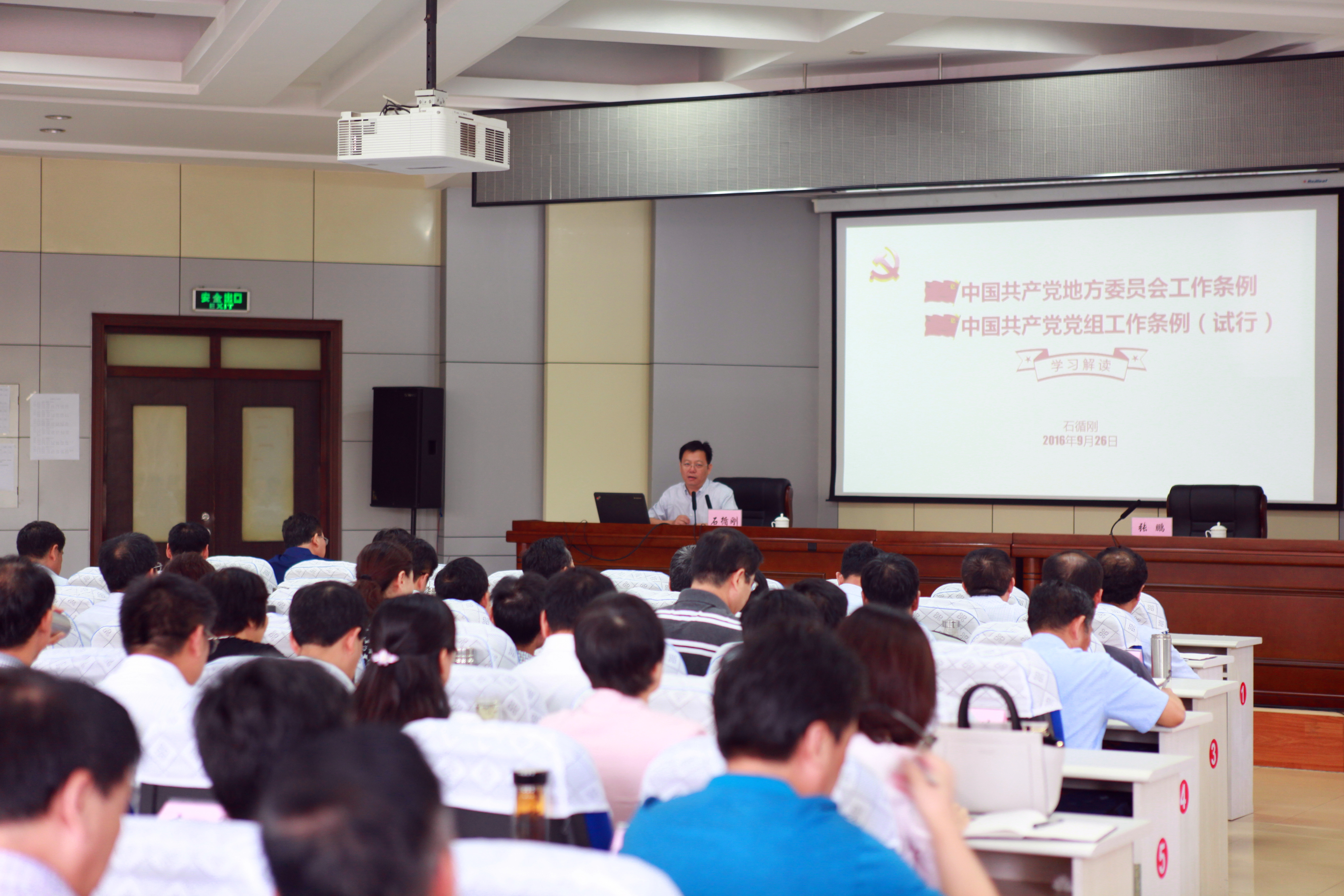 石循刚就《中国共产党党组工作条例(试行)》和《中国共产党地方委员会工作条例》相关问题进行了解读。报告首先对党的组织体系及主体间的相互关系进行了介绍,然后分别就两部《条例》的特点、意义及创新点进行了解读。