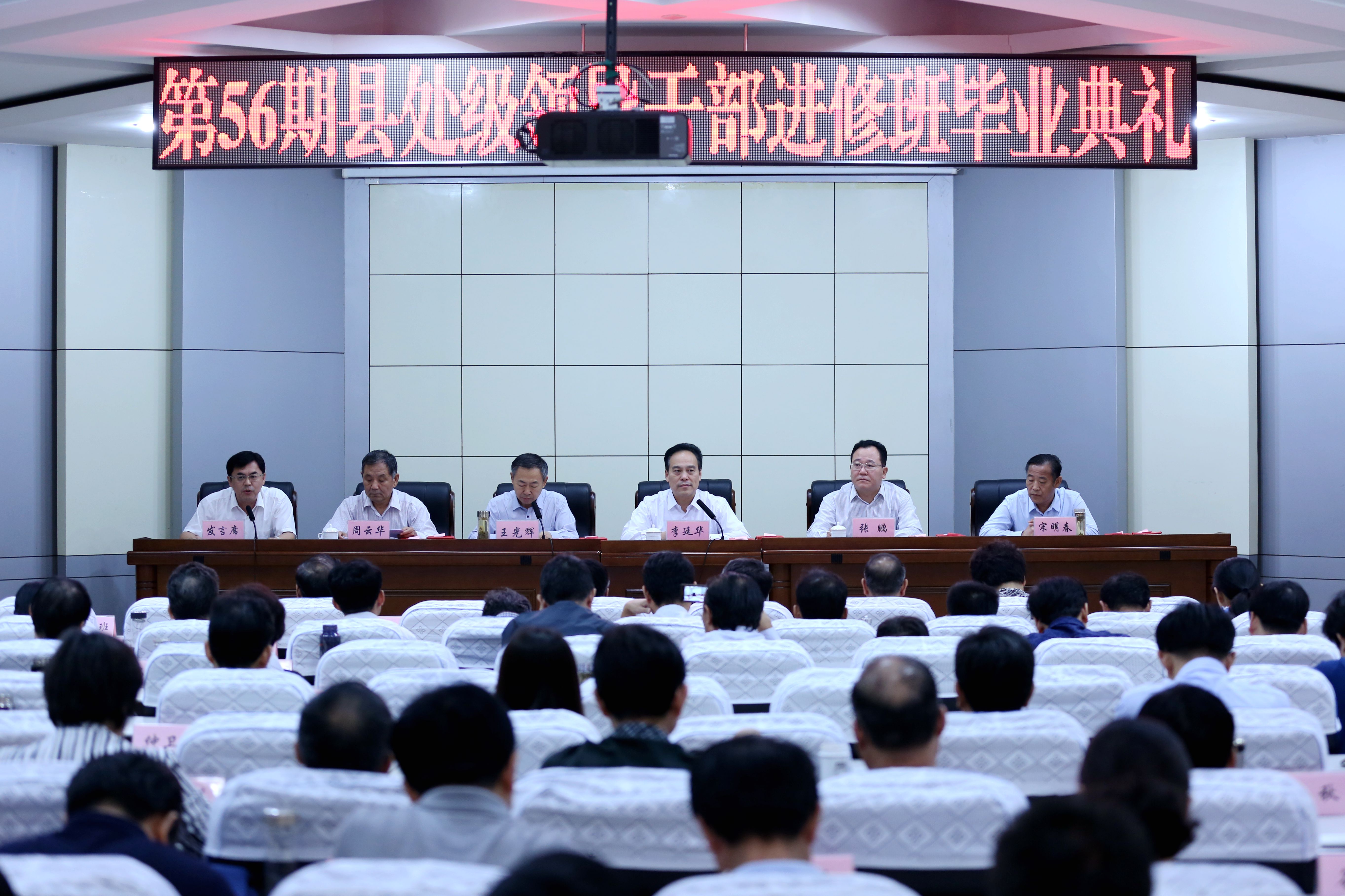 9月30日上午,我校举行第56期县处级领导干部进修班毕业典礼,常务副校长李廷华出席典礼并讲话,副校长张鹏、王光辉,校务委员、工会主席宋明春,调研员周云华出席典礼。
