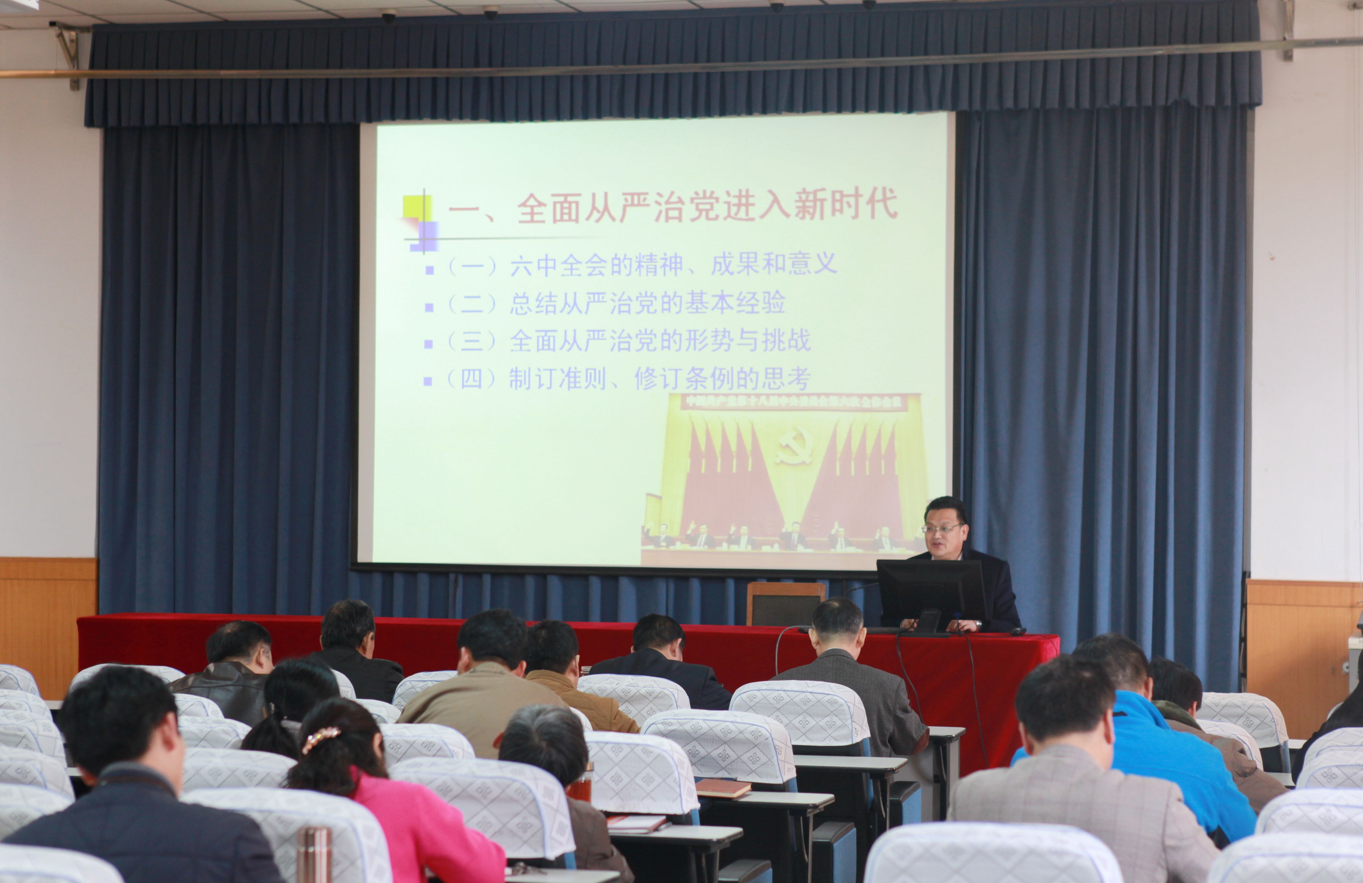 12月9日下午,我校举办党的十八届六中全会精神专题辅导报告会,党史党建教研室主任李寿峰教授以“坚定不移推进全面从严治党”为题作报告,全体党员参加了辅导报告会。