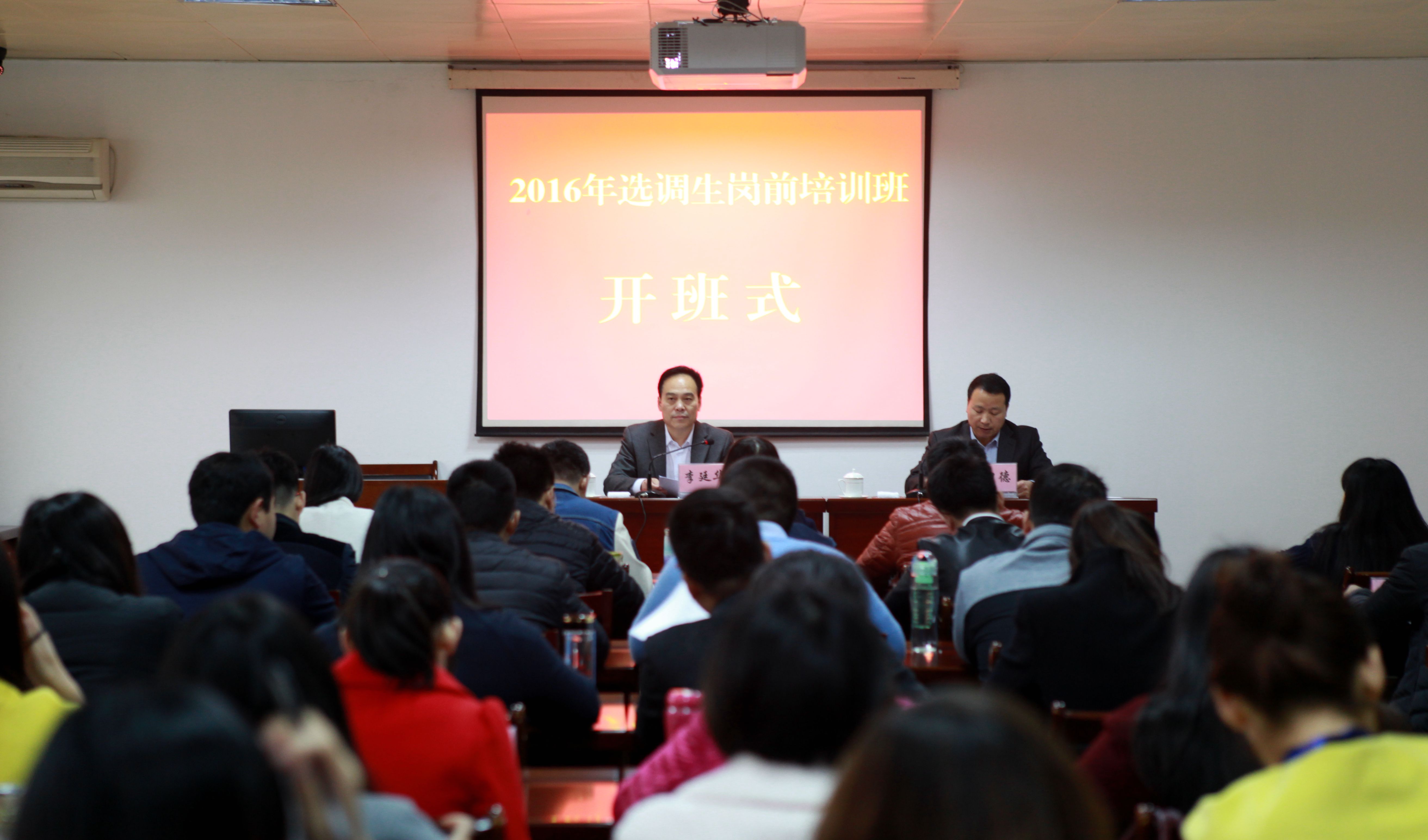 2016年新录用选调生岗前培训班全体学员、市委组织部干部一科及我校教务处工作人员共计70余人参加了开班式。