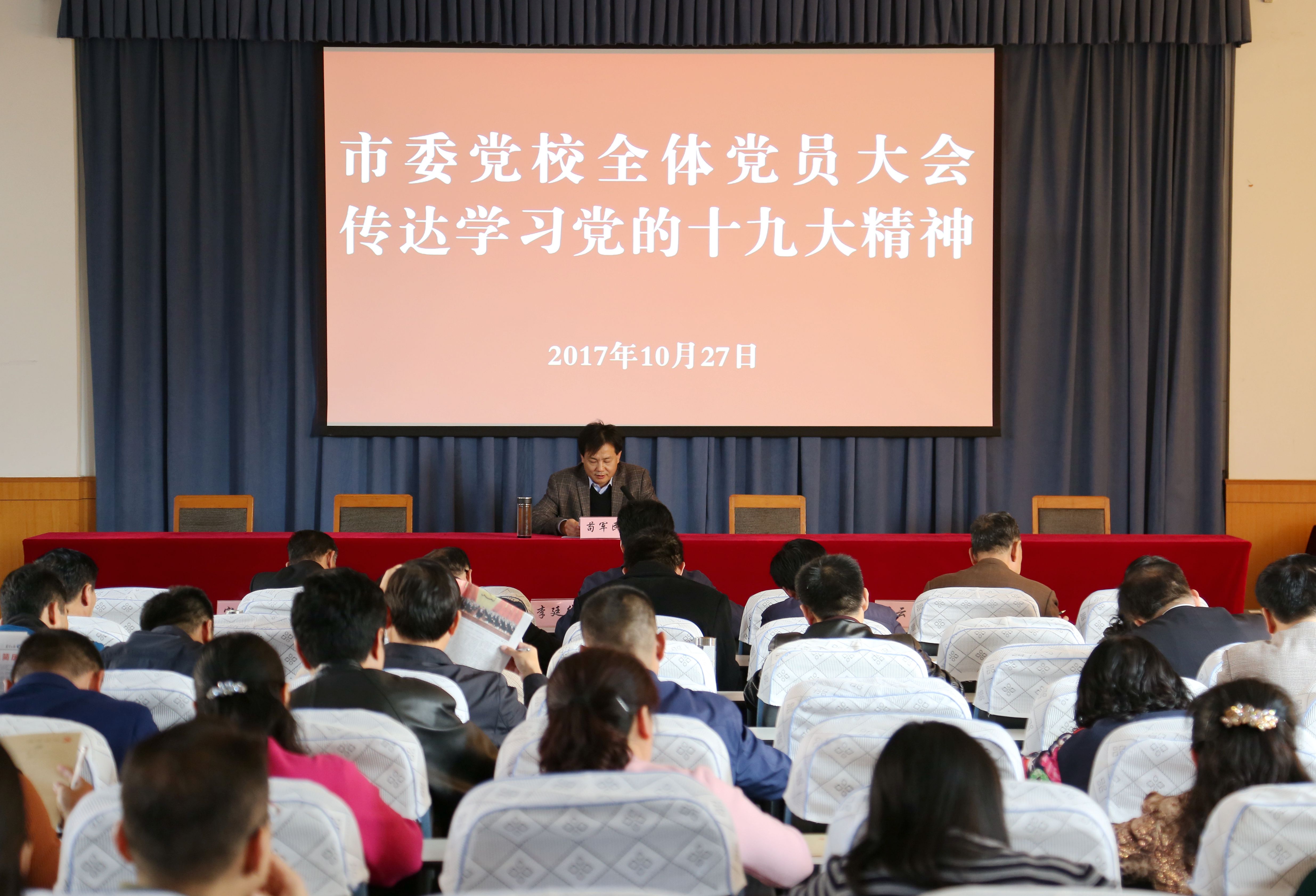 10月27日下午,我校在1号楼大阶梯教室召开全体党员大会,传达学习党的十九大精神。常务副校长李廷华,校务委员、工会主席宋明春,调研员周云华,我校全体党员参加了会议。