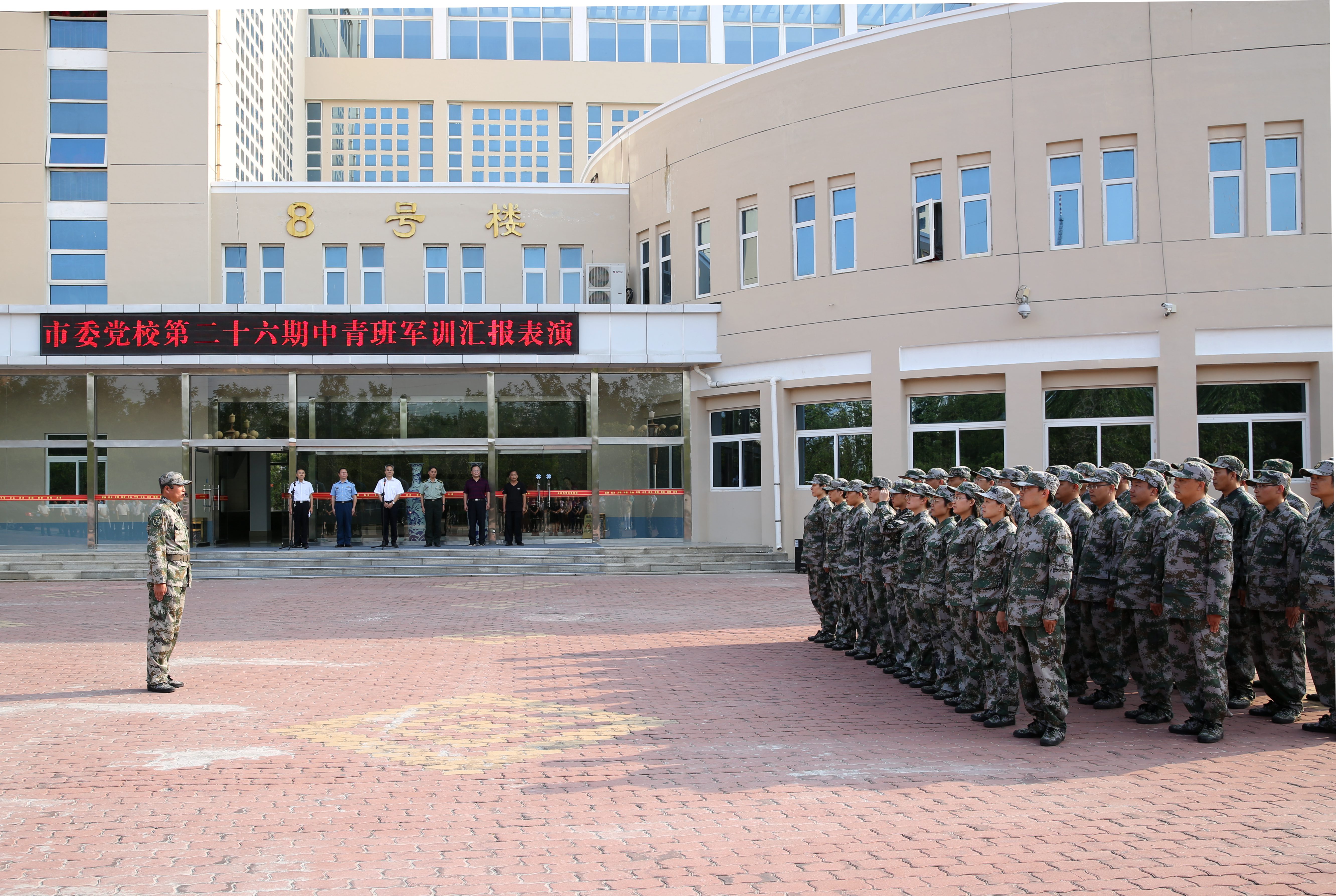 按照教学计划安排,9月4日—11日,第26期中青年干部培训班进行了为期6天的军训。9月11日下午,举行了精彩的军训汇报表演。常务副校长李廷华出席汇报表演并讲话,副校长王光辉主持汇报表演,东营区人民武装部部长国成才、政委朱序科,副校长张鹏,校务委员、工会主席宋明春出席汇报表演。
