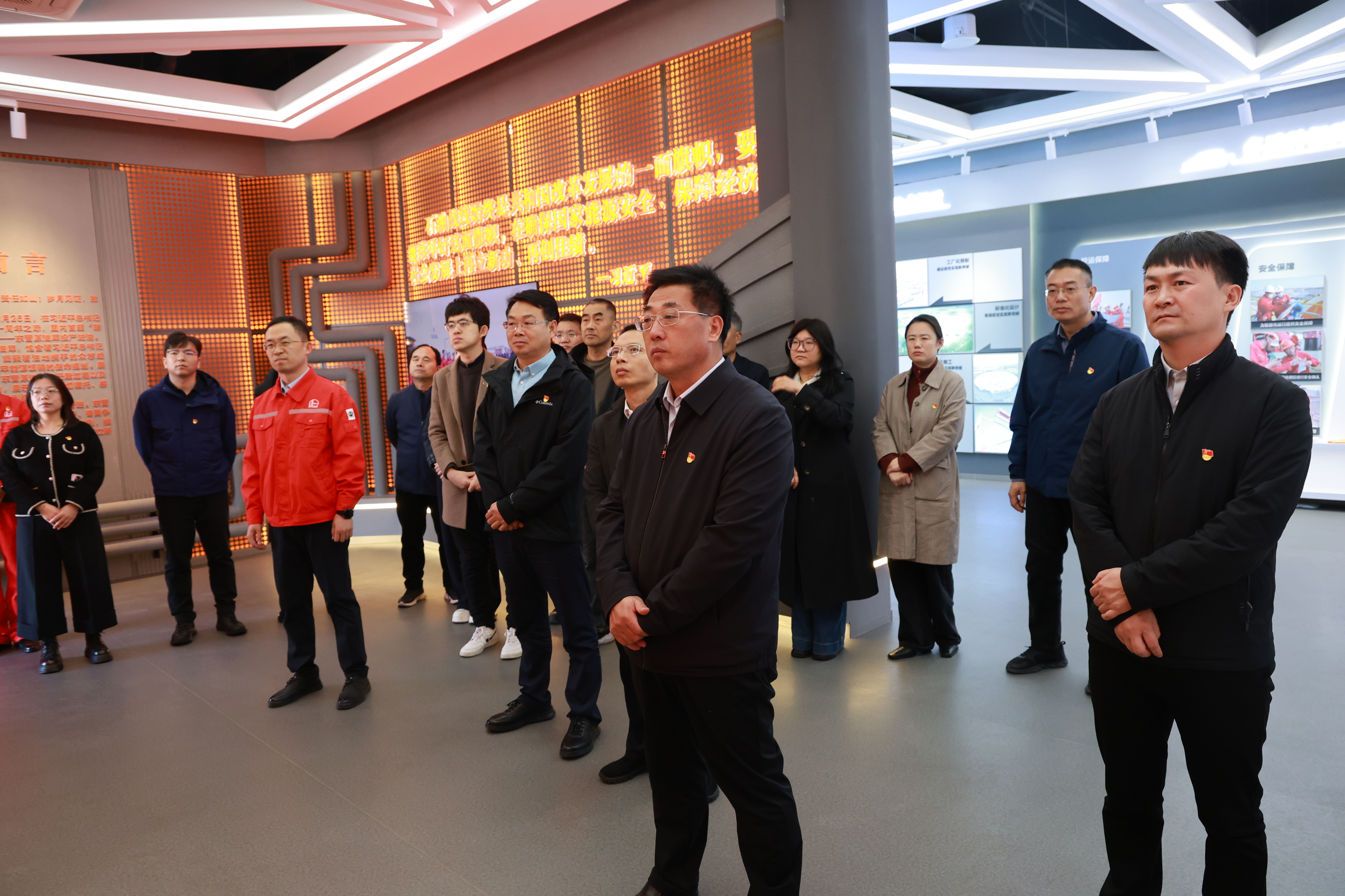 党课结束后,全体党员前往东营原油库参观胜利荣光展厅。通过展厅内的实物陈列、图文介绍等资料,深入了解东营原油库的发展历程与光荣成就,从中汲取艰苦奋斗、勇担使命的奋进力量。